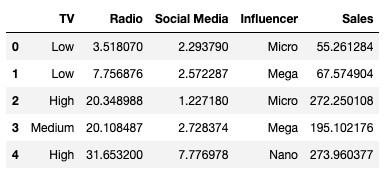 In this case study, we analyze a small business’ historical marketing promotion data. Each row corresponds to an individual marketing promotion in which the business uses TV, social media, radio and influencer campaigns to increase sales. The goal is to conduct a multiple linear regression analysis to estimate sales from a combination of independent variables.