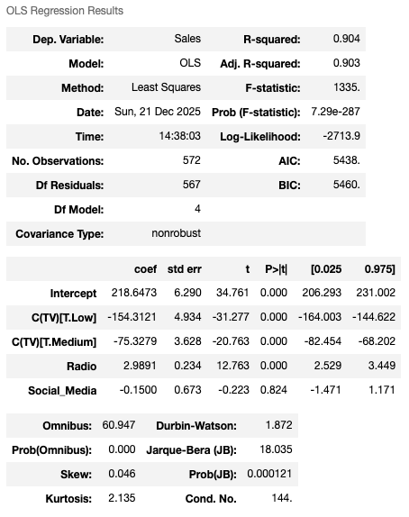 Based on the analysis above, unlike the exemplar’s conclusion, we are not dropping Social_Media because of multicollinearity. We are dropping it because it adds no marginal explanatory power once Radio and TV are already in the model. The lack of significance is due to redundancy, not problematic multicollinearity.